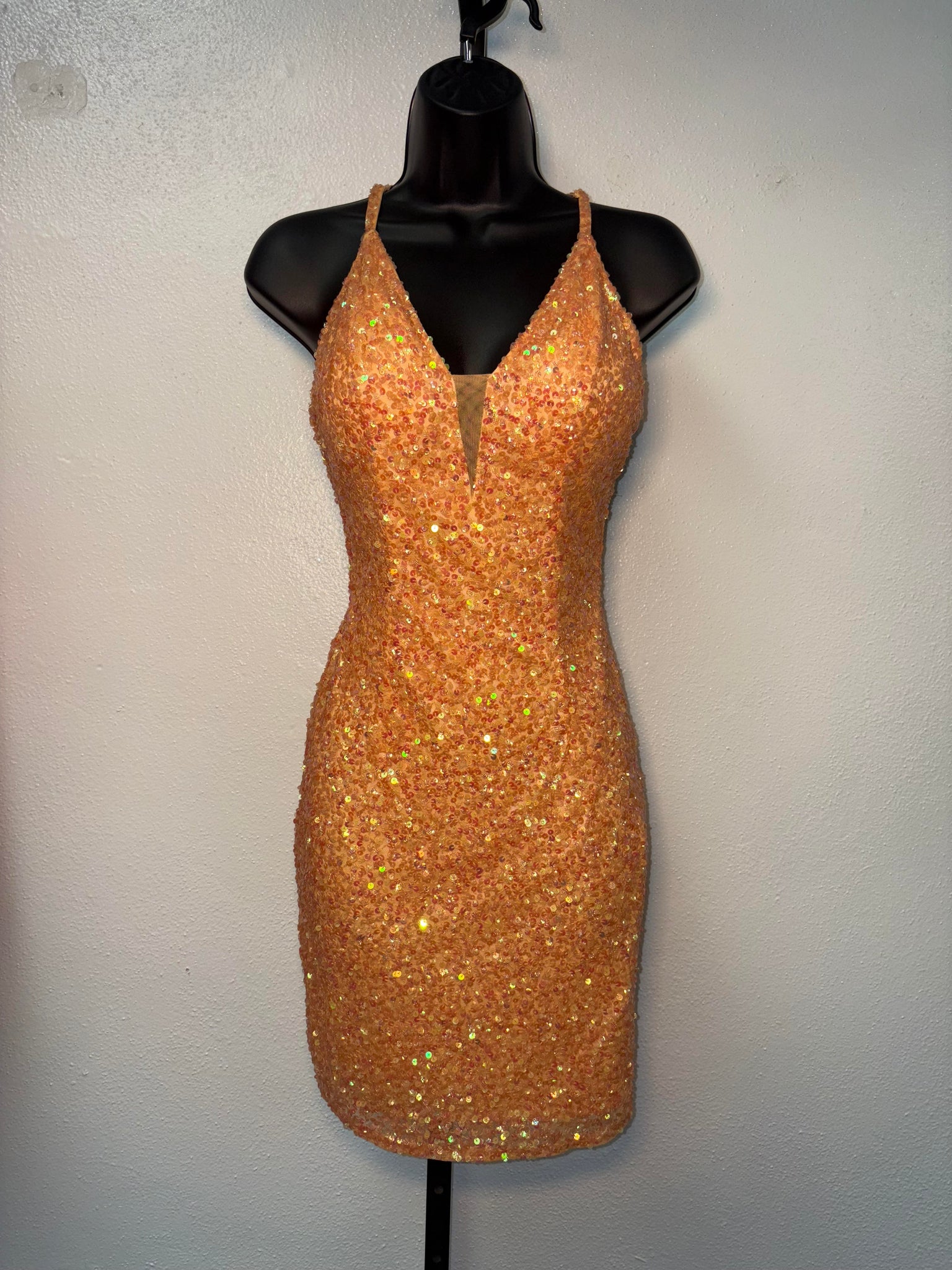 This dress is the epitome of elegance with a stunning V-neck and open back design, adorned with shimmering sequins. Perfect for cocktail parties or special occasions, it exudes sophistication and style.