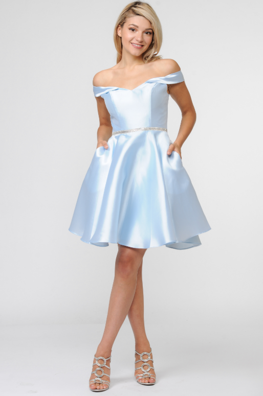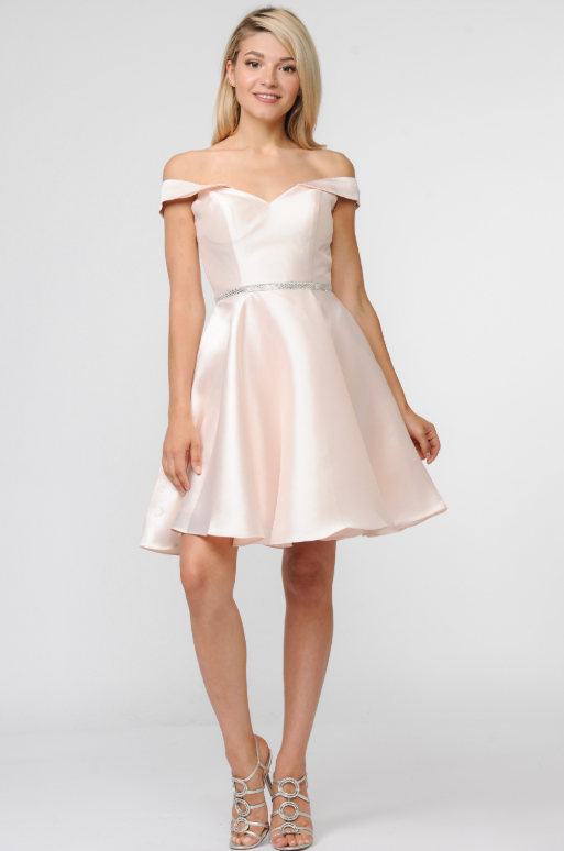 Elevate your elegance with this sophisticated mikado fabric short dress. Designed with a flattering off-the-shoulder neckline and a graceful sweetheart silhouette, it features a sparkling rhinestone belt that adds just the right touch of glamour. The discreet zipper closure ensures a sleek fit, making this dress perfect for refined occasions.