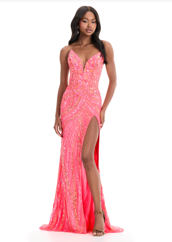Unleash your bold and daring side with the Ashley Lauren 11236 strapless gown. The modern floral sequin motif on the sweetheart neckline adds a touch of adventure to this stunning dress. With a bustier and skirt that are hand beaded and a left leg slit, this gown is perfect for those who love taking risks in fashion.