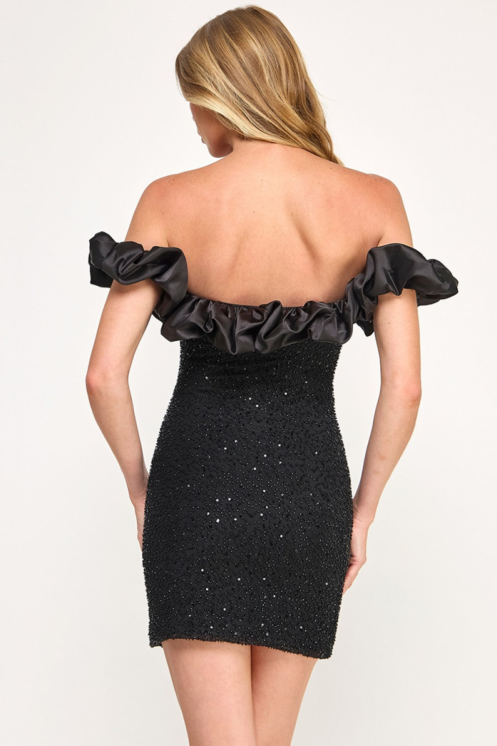 Elevate your evening style with this satin off-shoulder mini dress featuring a delicate ruffle and intricate mesh detailing adorned with subtle bead accents. The tube silhouette highlights your figure while offering a refined, modern elegance perfect for special occasions. This dress blends texture and shine for a sophisticated statement that ensures you stand out gracefully.