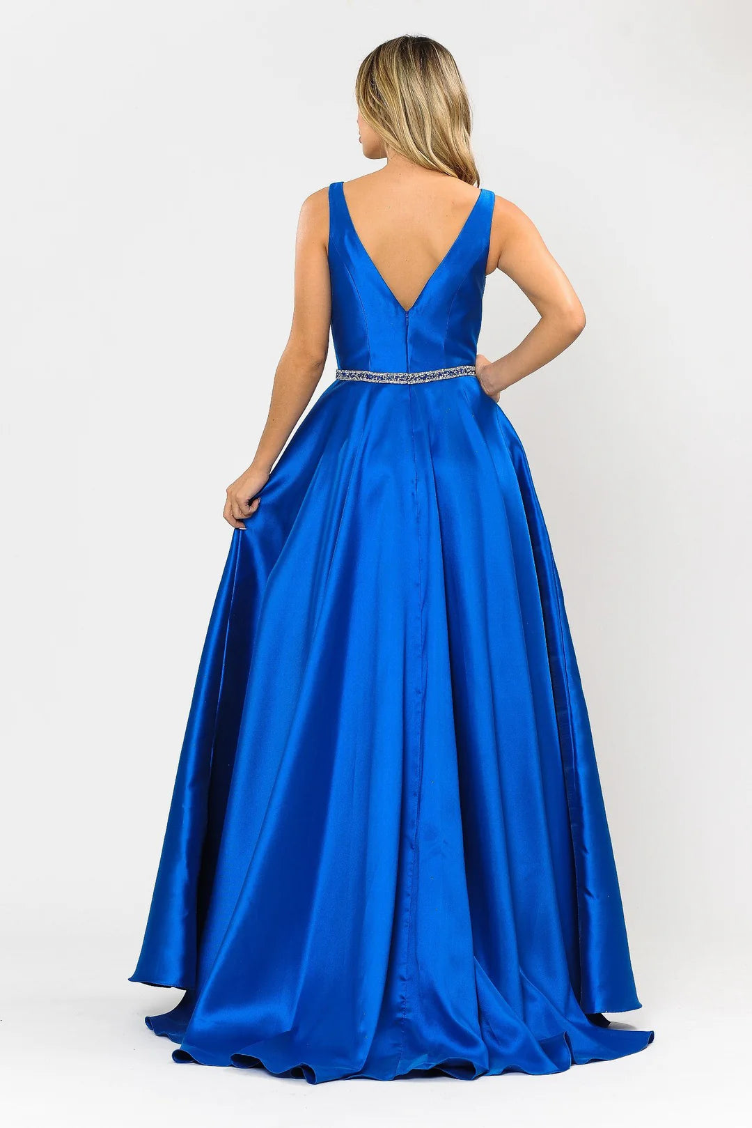 Elevate your elegance in this long mikado illusion V-neck gown designed with sophistication. The sleeveless deep V-neck bodice is tastefully secured with a sheer inset panel, complemented by a delicate beaded waistband that enhances your silhouette. Featuring an open V-back and convenient side pockets, this floor-length A-line skirt with a sweep train glides gracefully with every step. Finished with a zipper closure, this formal dress combines refined details with timeless style for unforgettable occasions.