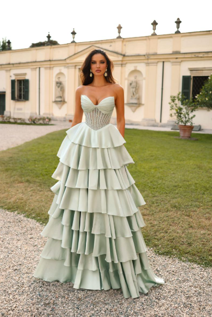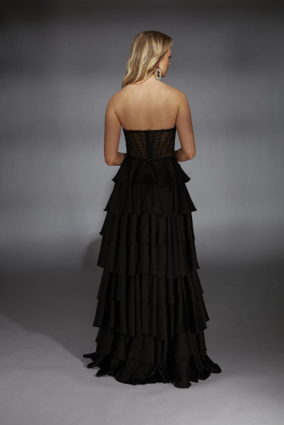 The Alyce 61833 commands attention with its strapless V-neckline and structured corset waist that sculpts an elegant silhouette. Luxurious satin chiffon drapes into a graceful A-line skirt adorned with tiered ruffles, creating movement and dimension. This gown balances refined sophistication with playful details, making it an ideal choice for formal events where you want to feel poised and radiant. The timeless design ensures you'll look and feel like the best version of yourself, whether you're the center of attention or capturing candid moments.