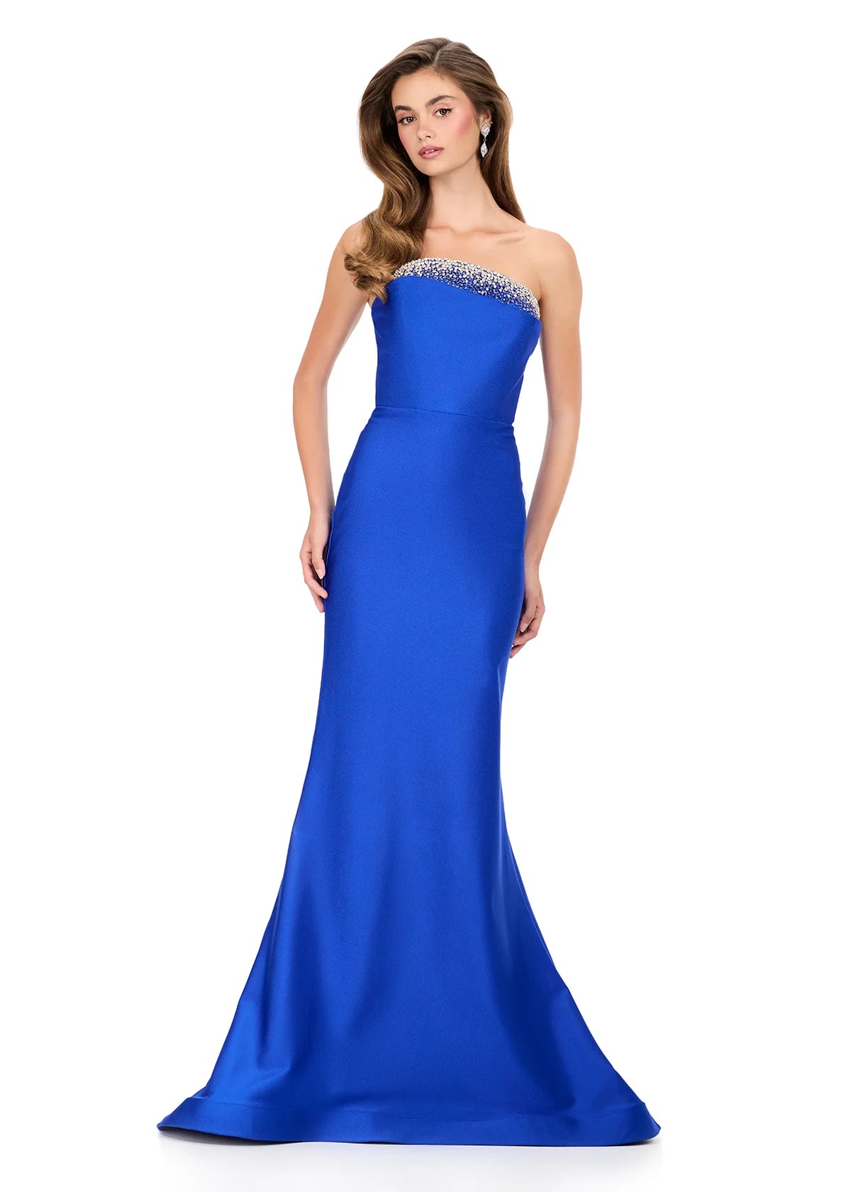 Turn heads in this stunning Ashley Lauren strapless gown, where refined elegance meets modern glamour. The custom-fitted jersey silhouette hugs your curves beautifully, while an intricately beaded neckline catches the light with every movement. A graceful sweeping train completes this show-stopping design, perfect for making an unforgettable impression at your most important moments.