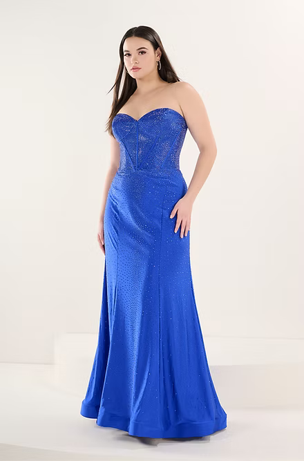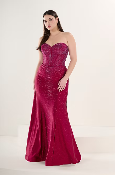 Embrace timeless elegance in this stunning House Of Wu gown. The strapless sweetheart neckline frames the shoulders beautifully, while a structured corset-style bodice with visible boning provides impeccable support and contouring. Cascading stone embellishments create a mesmerizing starlit effect across the bodice and down the skirt. Crafted from stretch shimmer jersey, this luxurious fabric molds to your curves while maintaining comfort and flexibility. The silhouette gracefully transitions into a subtle mermaid flare, accentuating your natural shape. A clean strapless back with continued boning details and a refined sweep train complete this sophisticated design, perfect for unforgettable evenings.