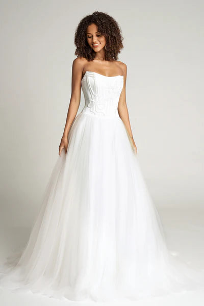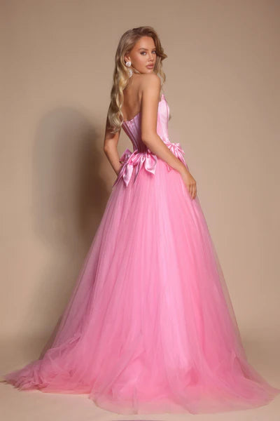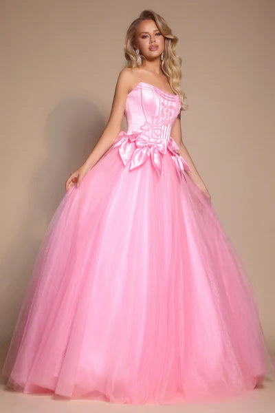 Portia & Scarlett's PS26102 seamlessly blends fairy tale romance with contemporary couture elegance. The strapless corset bodice features structured boning and intricate embellishments that sculpt and define, while soft satin bows grace the waistline with refined charm. Cascading into a voluminous tulle skirt, the dramatic A-line silhouette commands attention with graceful movement and timeless ballgown allure. Perfect for formal galas, proms, or milestone celebrations, this gown delivers princess-worthy sophistication with a modern sensibility that feels both enchanting and utterly current.
