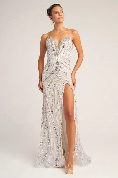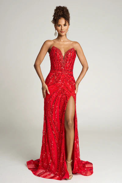 Portia & Scarlett PS26418C embodies show-stopping elegance for the confident, sophisticated woman. This stunning gown features a structured sweetheart neckline and corset-style bodice adorned with radiant beadwork that sculpts and contours the figure beautifully. Intricately placed embellishments create an alluring illusion effect, enhancing natural curves while drawing focus to the waist. A dramatic thigh-high slit adds modern edge, while the sweeping train flows gracefully with every movement. Refined, radiant, and irresistibly captivating—this design captures contemporary glamour at its finest.