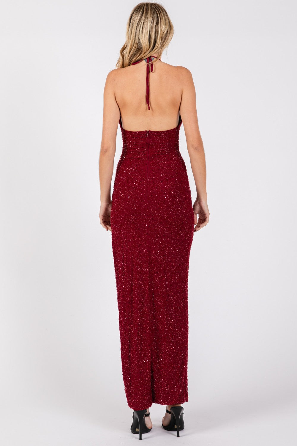 Elevate your evening wear with the Bead Cowl Maxi Dress, designed for a striking and sophisticated silhouette. Featuring a full maxi length and a halter neck tie, it drapes elegantly with delicate beading details that add subtle shimmer. The high side slit enhances movement and allure, while the fitted, bodycon cut flatters your figure. Finished with a back zipper and a fully lined interior, this dress combines comfort with refined style for your most memorable occasions.