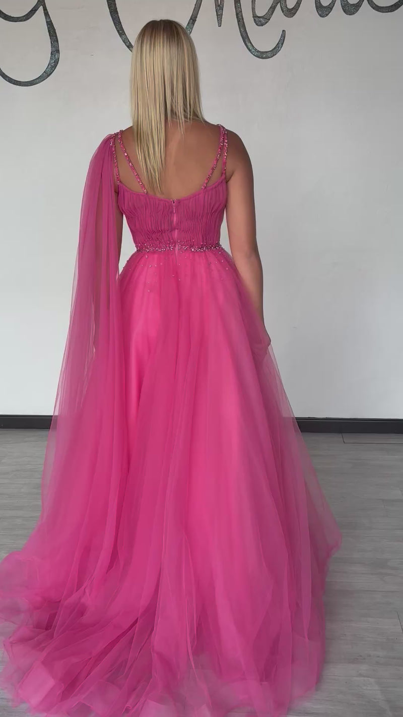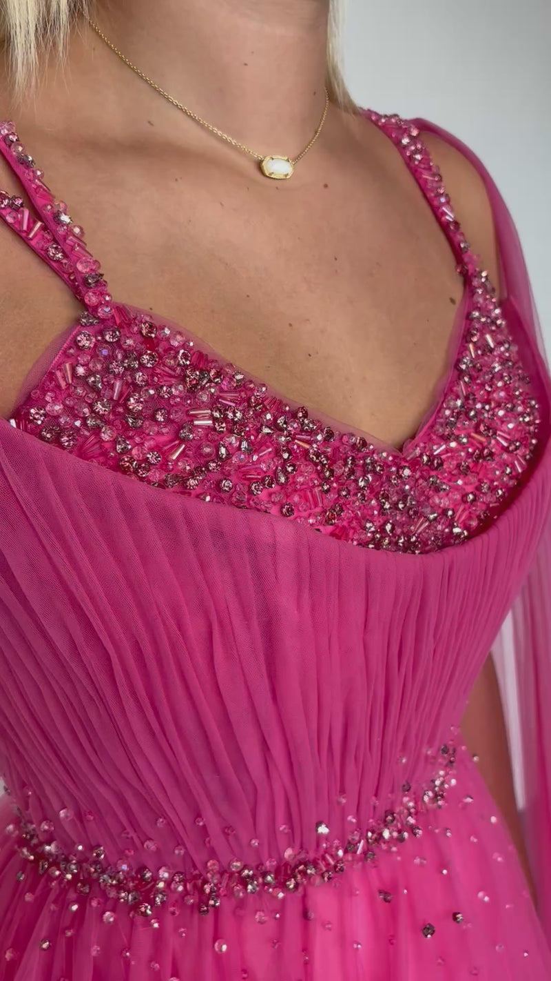 This elegant long A-line dress from Mambo Couture features intricate stone and bead detailing along the bust and waistline, enhancing its refined silhouette. The addition of a graceful shoulder cape adds a touch of drama and sophistication, making it perfect for formal occasions where timeless style is essential.