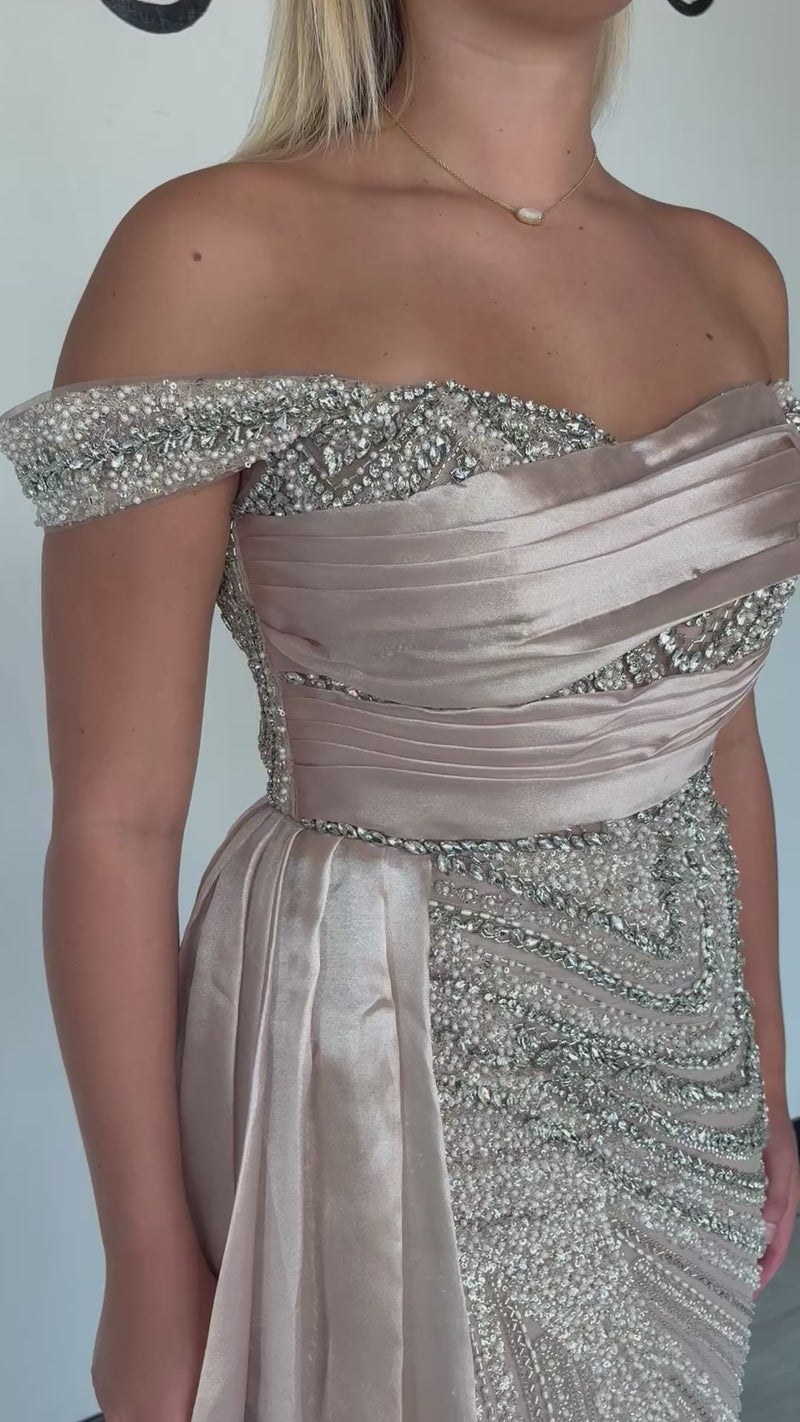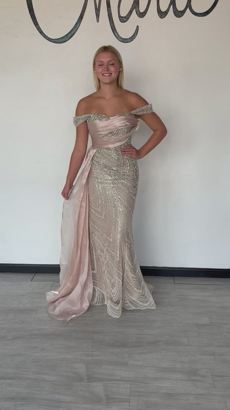This couture elegant off-the-shoulder long dress from Mambo Couture features intricate stone and bead embellishments throughout, creating a stunning, sophisticated look. The addition of a graceful side cape adds a dramatic flair, perfect for making a memorable entrance at any formal event.
