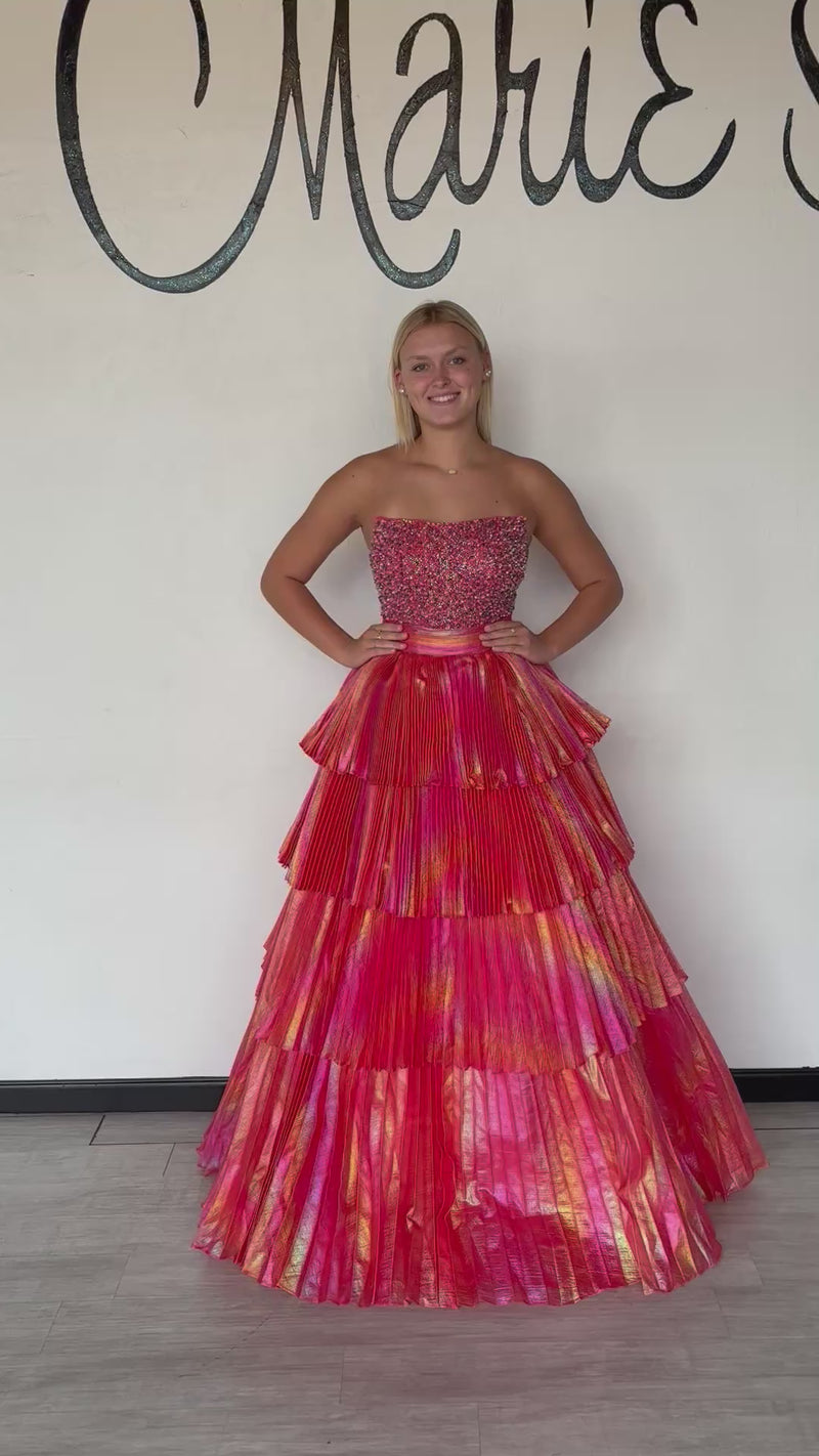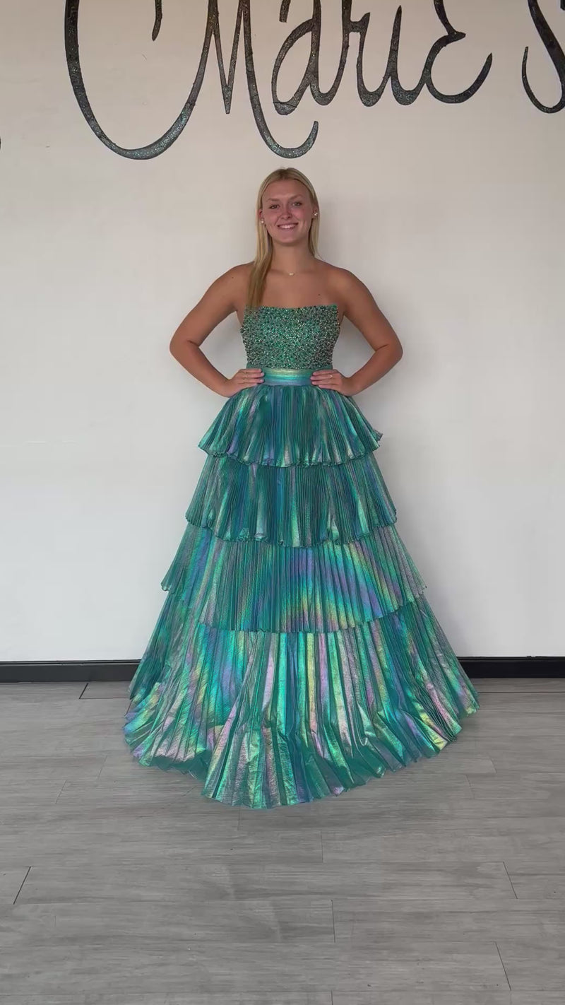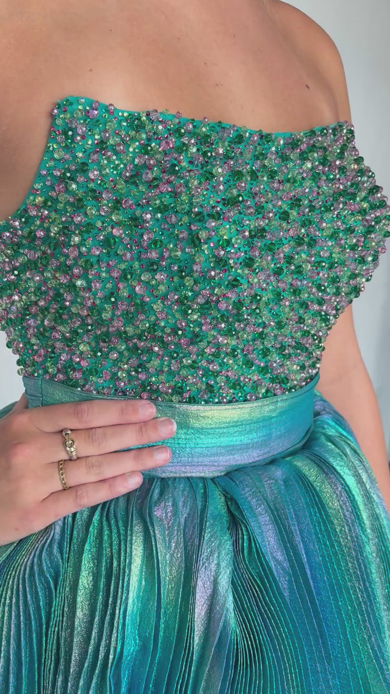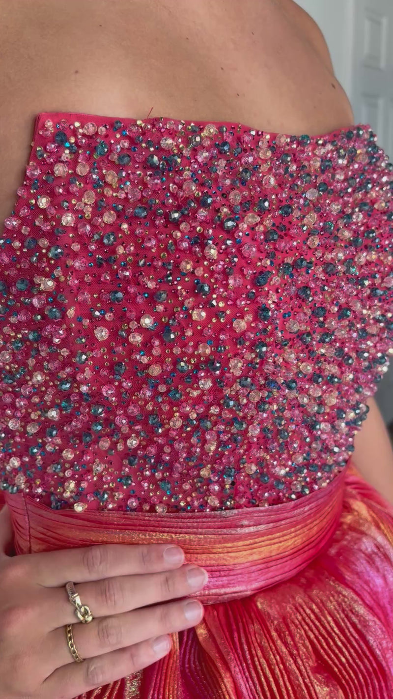 Elevate your elegance with the Mambo Couture 917MG780, a couture a-line strapless dress that captures light with its iridescent fabric. The fully stoned and beaded bust adds intricate detail and luxurious shine, creating a refined and memorable look for any special occasion. Designed to flatter, this dress blends timeless silhouette with exquisite craftsmanship for a sophisticated statement.