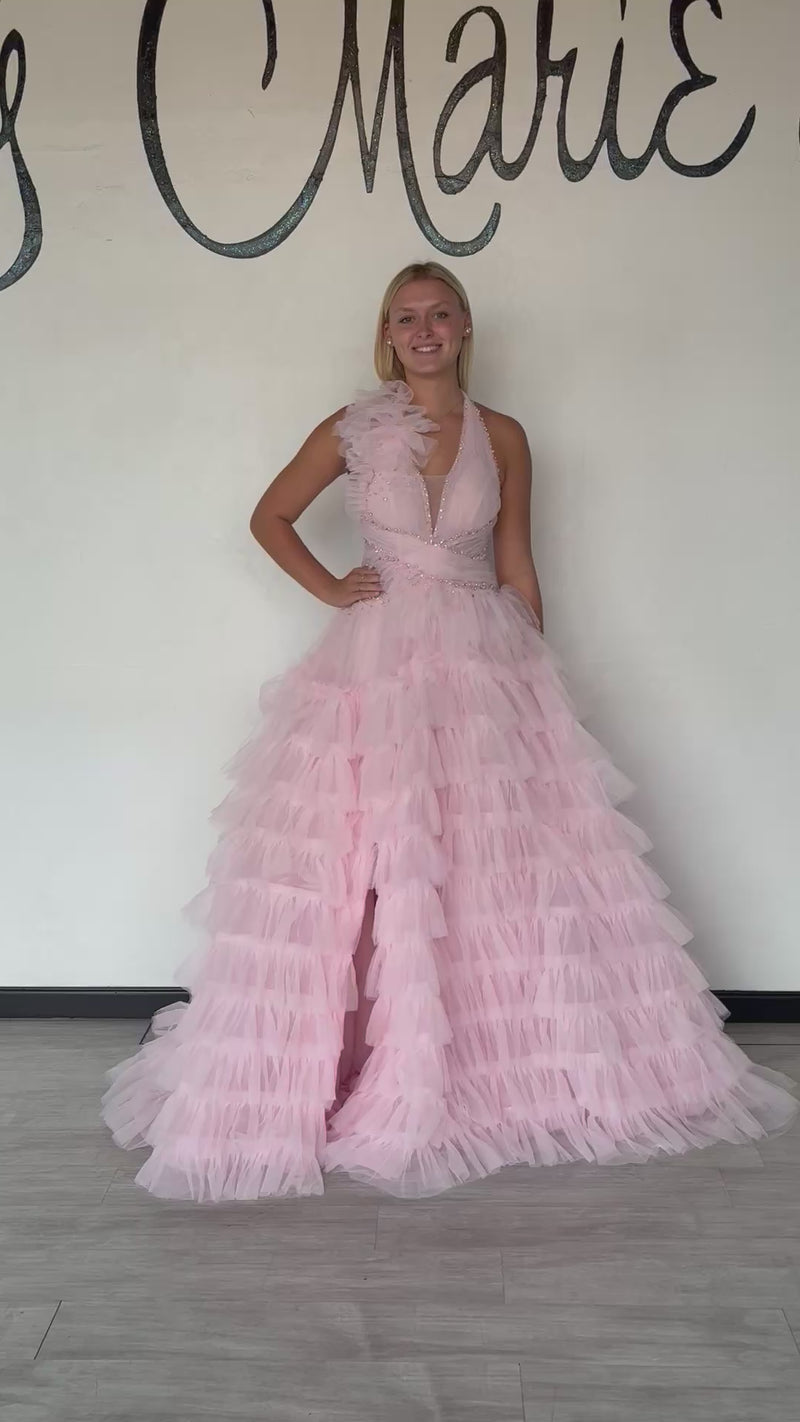 Elevate your evening with the Mambo Couture 928MG834, a refined long A-line dress featuring a delicate tiered tulle skirt that adds graceful volume. The halter neckline is elegantly adorned with intricate beading and sparkling stones, creating a stunning focal point. Perfect for formal occasions, this dress combines timeless silhouette and exquisite detailing to enhance your sophisticated style.