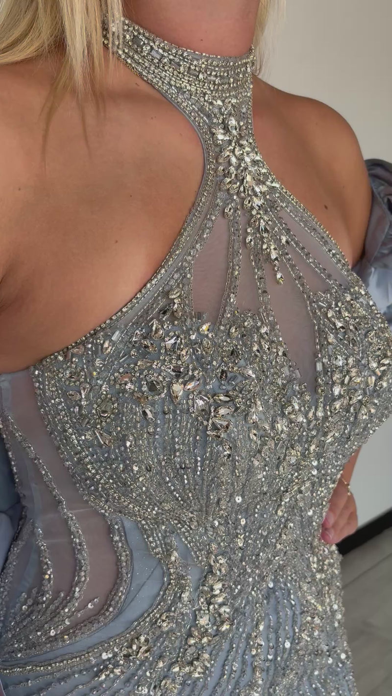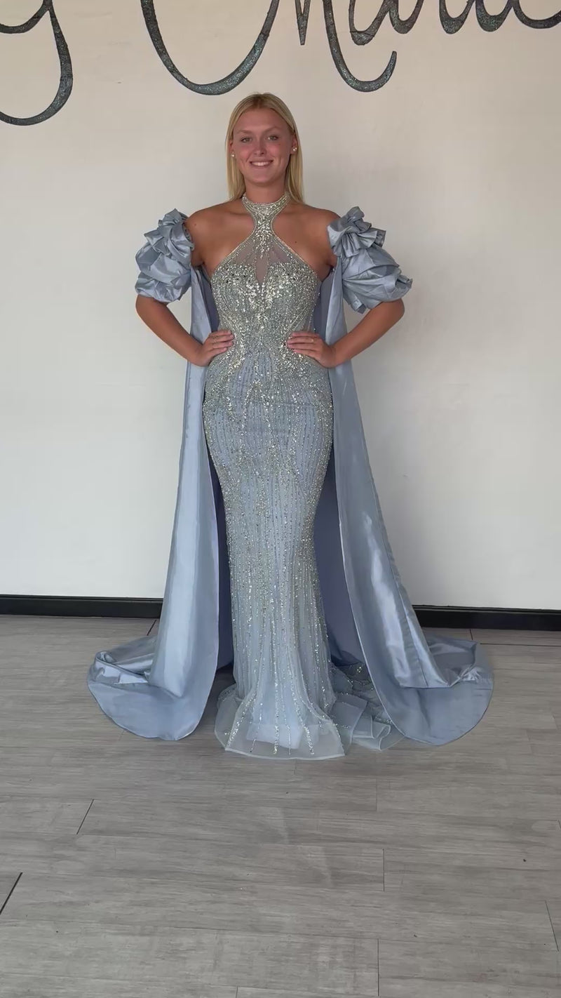 Experience elegance with the Mambo Couture 955MG505, a couture fitted long dress featuring a halter top fully adorned with stones and beads. Its separate, flowing cape adds dramatic sophistication, allowing you to customize your look effortlessly for any formal occasion.